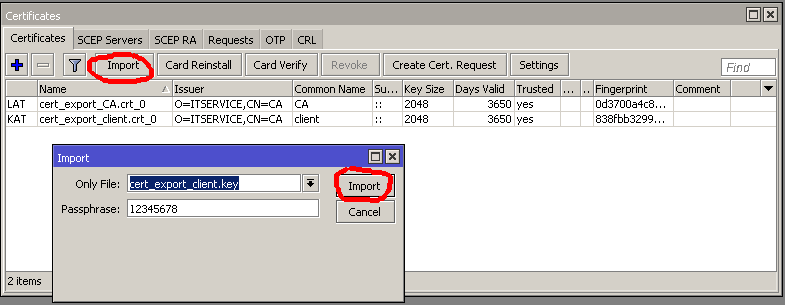 A imagem abaixo é apenas uma prévia no RouterOS via Winbox se os certificados foram criados em / Certificados e exportados para / lista de arquivos . Se tudo está bem aqui no seu roteador que será um servidor OpenVPN, essas duas janelas devem ficar assim.