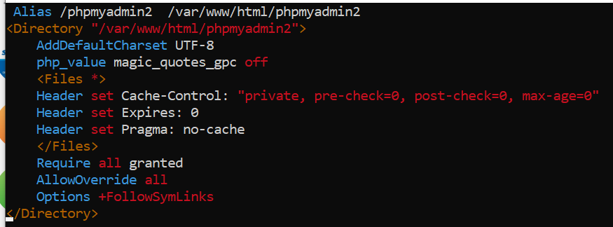 root@:/home/uferes# vim /etc/apache2/sites-enabled/phpmyadmin.conf Alias /phpmyadmin2 /var/www/html/phpmyadmin2AddDefaultCharset UTF-8 Header set Cache-Control: "private, pre-check=0, post-check=0, max-age=0" Header set Expires: 0 Header set Pragma: no-cache Require all granted AllowOverride all Options +FollowSymLinks